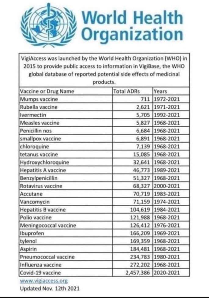 Welt Gesundheits Organisation – Aufstellung der Nebenwirkungen – 12. November 2021