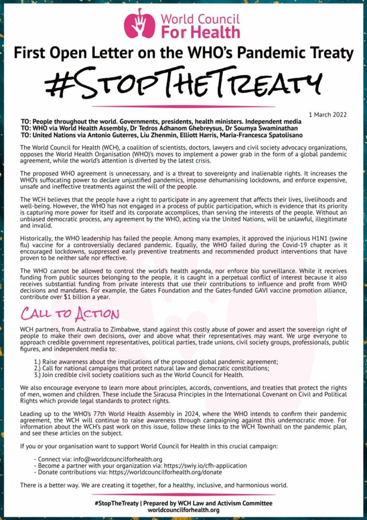 Das World Councel for Health (https://worldcouncilforhealth.org/?lang=de) ist ein Zusammenschluss von Ärzten und anderen Partnern weltweit. Sie sind unabhängig und haben große Bedenken was das weltweite Gesundheitswesen und mehr betrifft. Diese werden in ihren wöchentlichen Videokonferenzen besprochen. Ihr erster offener Brief gegen eine zentrale Steuerung der Welt ist hier zu lesen: